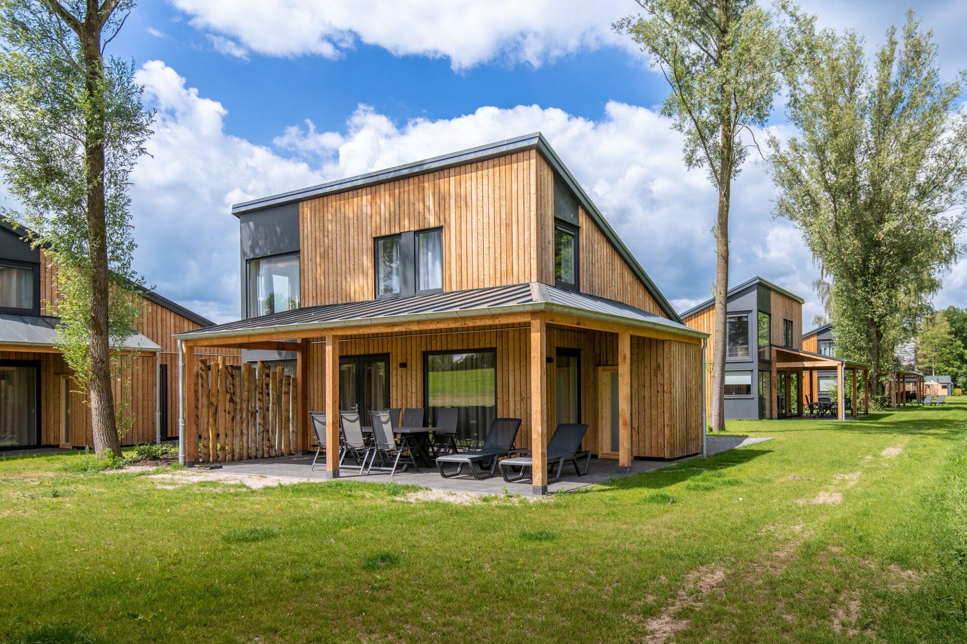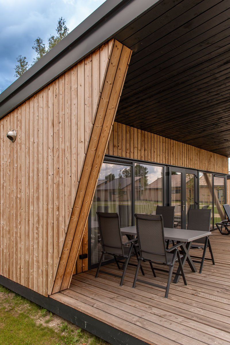 Voor een recreatiepark heeft Cretim gewerkt aan de constructie van 19 vakantiehuizen op RCN Vakantiepark Zeewolde. Deze moderne vakantieverblijven met twee etages bieden plaats aan 6 personen en stralen luxe uit. De keuken is uitgerust met een inductiekookplaat, afzuigkap, koelkast, spoelbak met mengkraan en combimagnetron. De bungalow beschikt over openslaande deuren naar een overdekt terras. Op de begane grond bevindt zich één slaapkamer, terwijl op de bovenverdieping twee slaapkamers met elk twee bedden zijn. De badkamer is voorzien van een douche, wastafel en toilet. Geniet van de rust op het overdekte terras en parkeer gemakkelijk uw auto. Dit is het vakantiehuis dat te zien is op de foto rechtsboven. Naast dit model heeft Cretim ook andere varianten gebouwd, zie de foto linksonder.